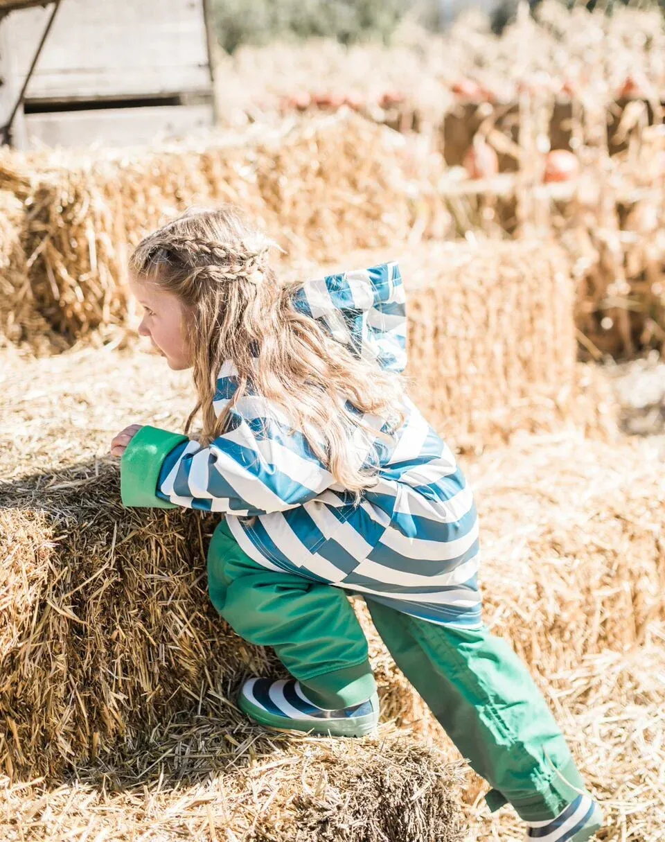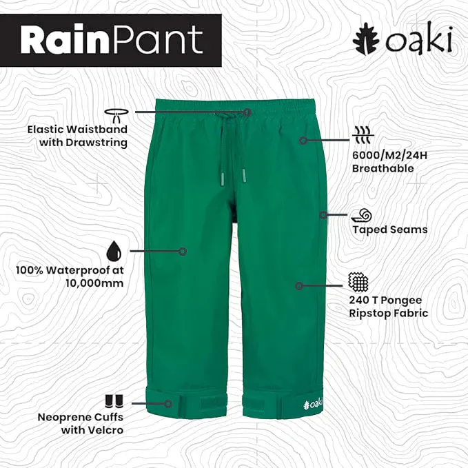Full-featured rain/trail pants for outdoor play and adventuring designed with an elastic waistband and adjustable Velcro strap neoprene ankle cuffs. Features also include a bar-tacked drawstring at the waist to help when little ones are growing which meets CPSC standards.