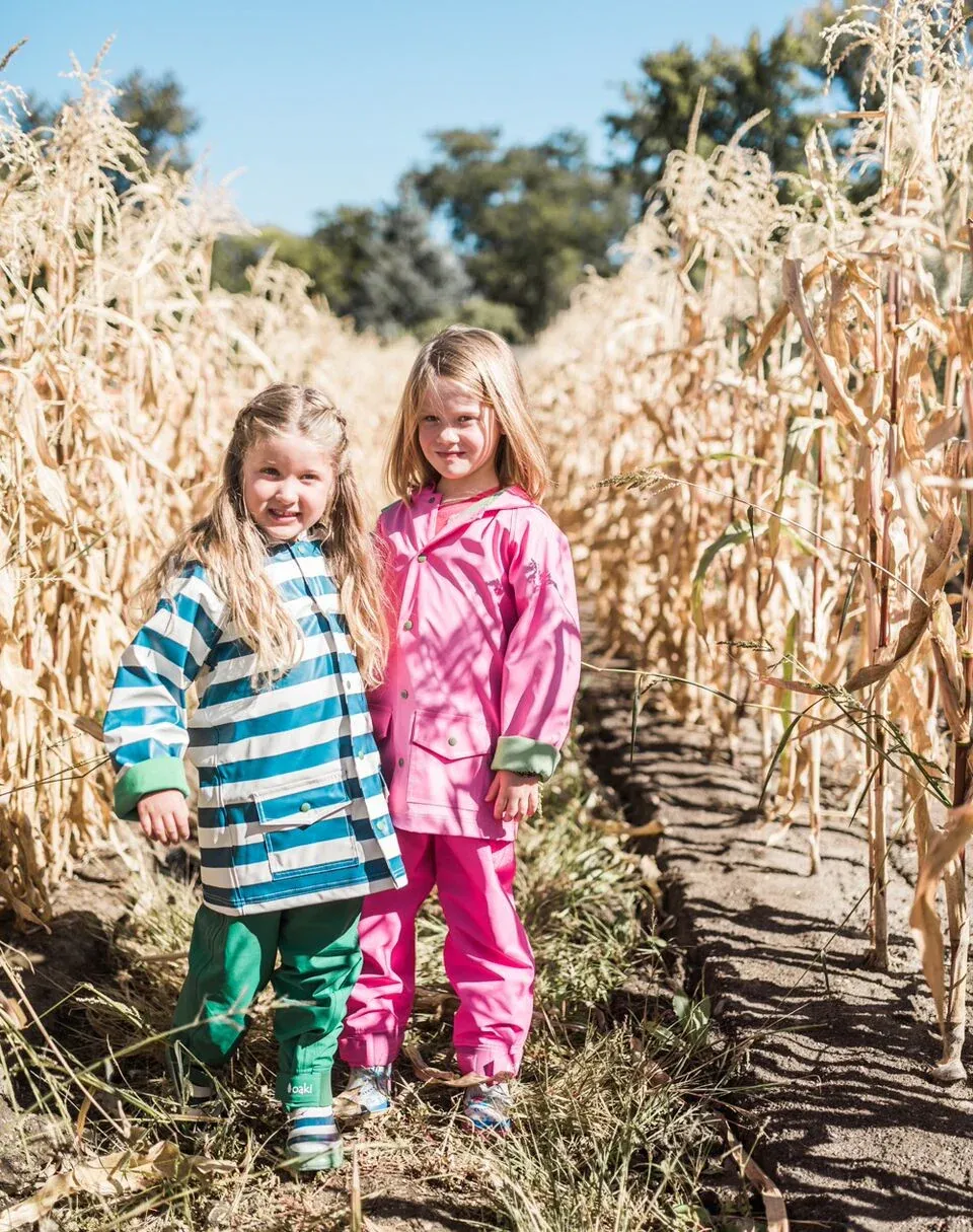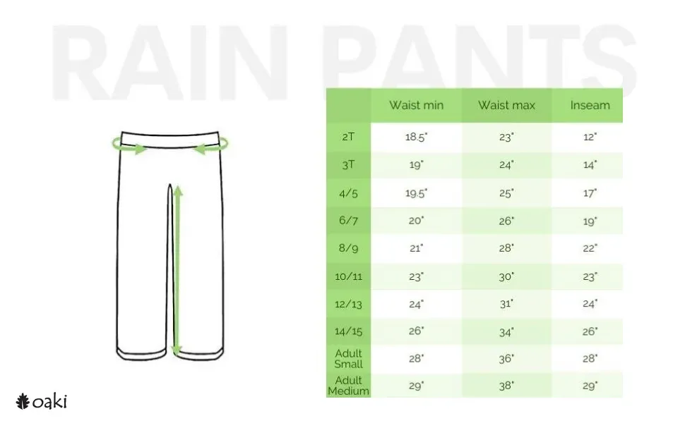These rain pants are tough – made with 240T pongee with a transparent TPU membrane for durable waterproofing. Whether you’re hiking, camping, jumping on the playground, or simply caught in the rain, these rain pants will keep your child dry and happy. Roomy enough to fit over most under layer clothing. Dirt and mud wash off easily. Hand washing and air drying recommended.