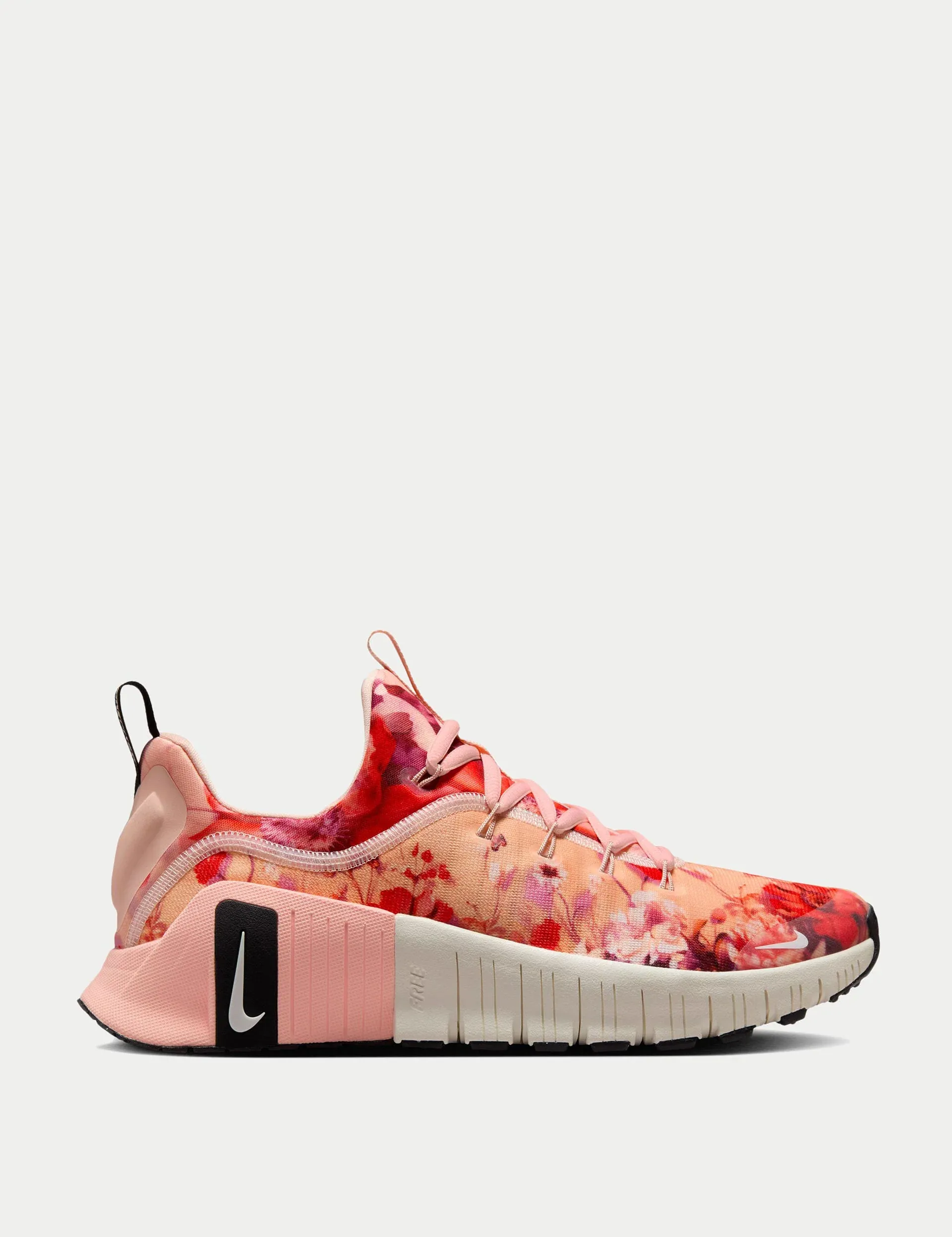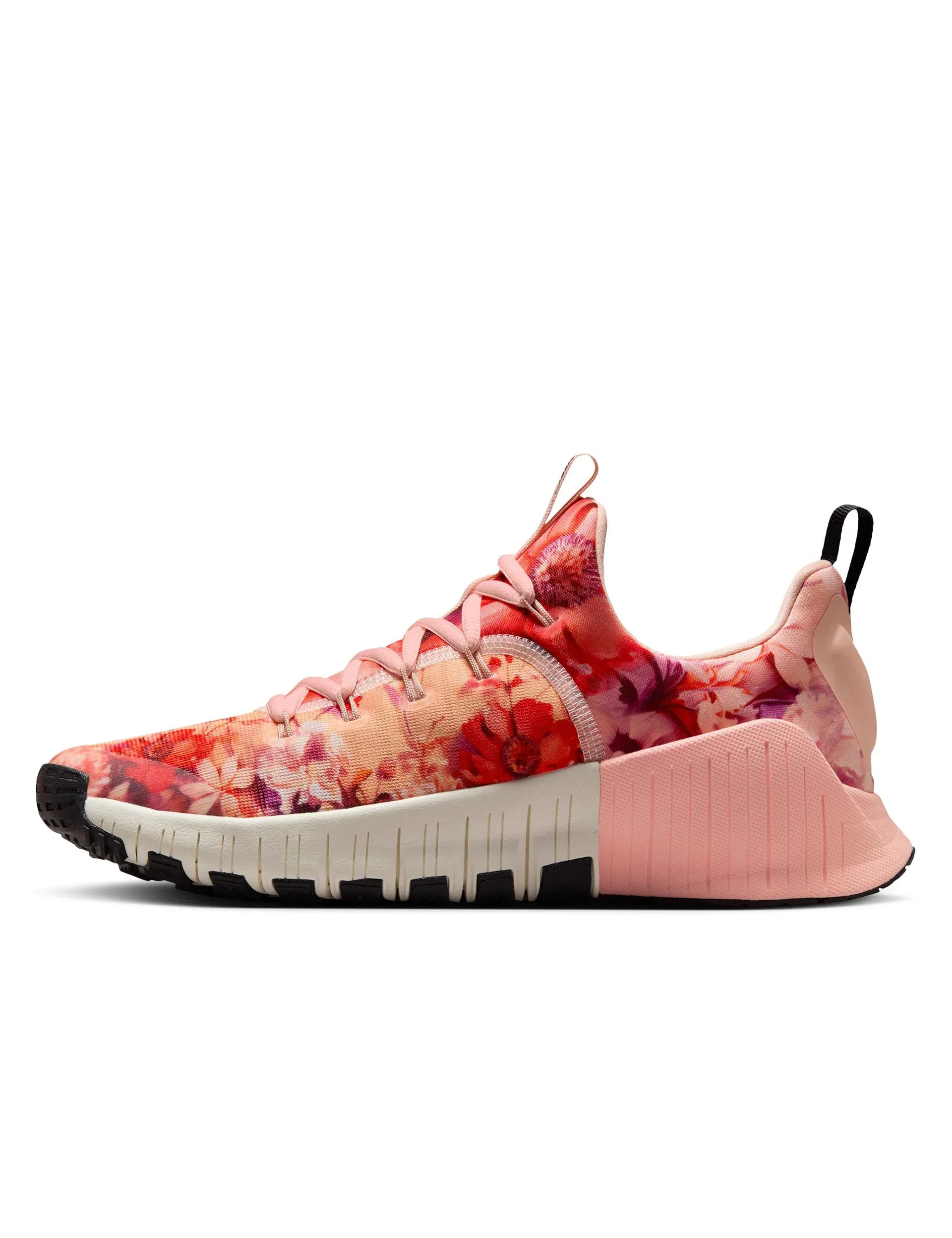 Jump into action with the Free Metcon 6, designed for ultimate flexibility and stability, featuring a laser-siped outsole and added heel foam for secure, natural movement. Experience high cushioning for maximum comfort and impact protection, combined with a breathable engineered mesh upper that supports every dynamic move. This floral-themed design spruces up your workout as you breeze through the room.