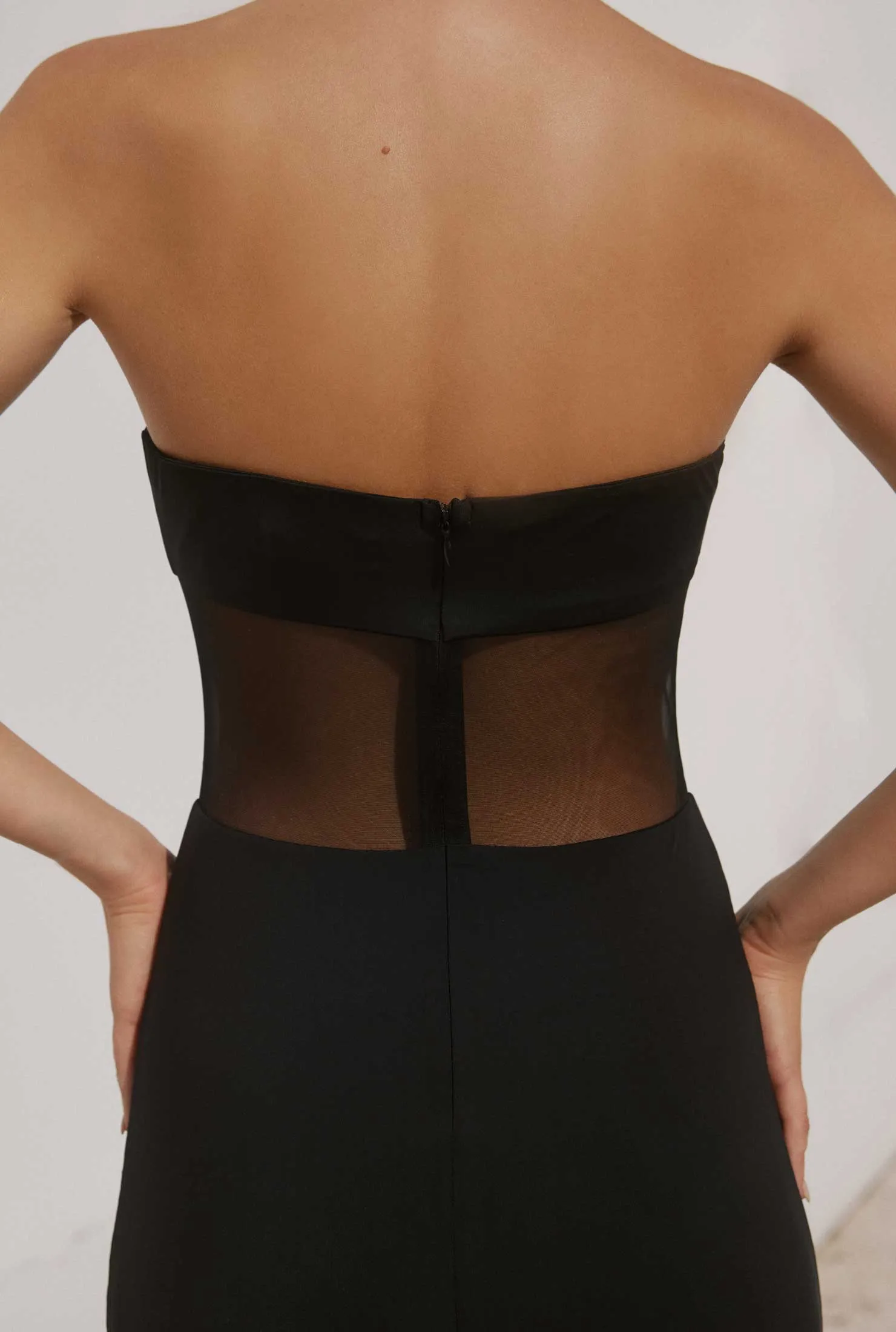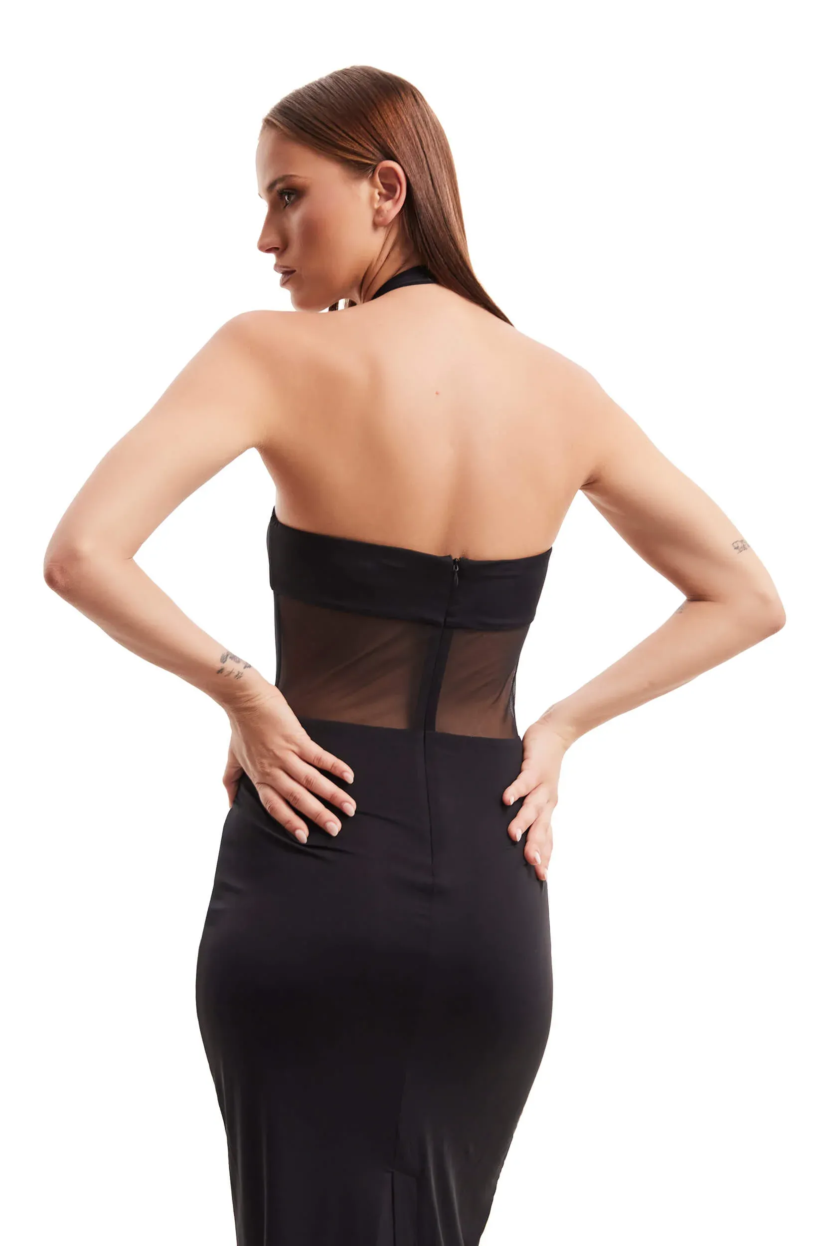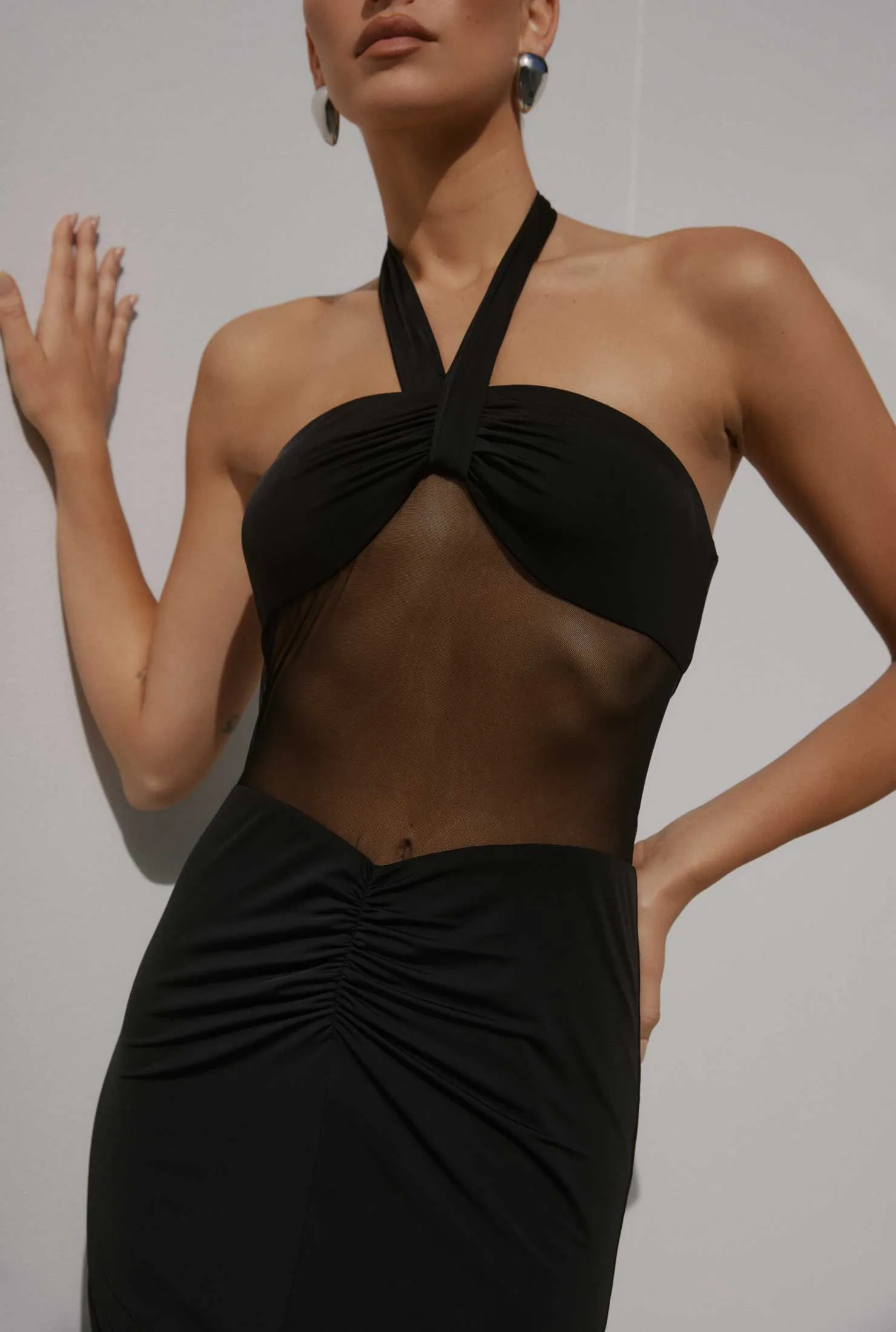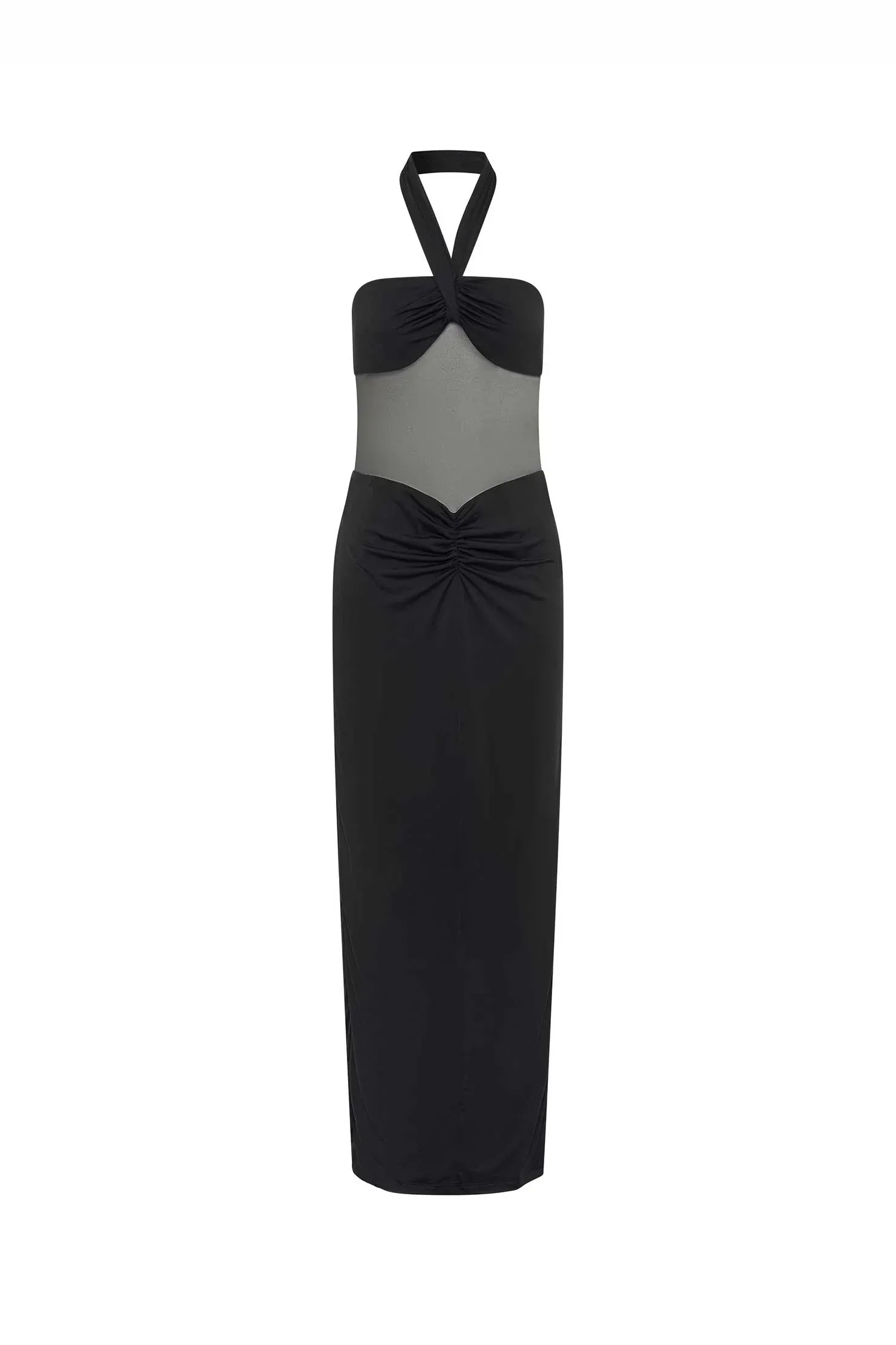 The Cody Dress by Nakedvice is a slinky black maxi dress. Featuring a halter neck and mesh detailing around the stomach, The Cody Dress is the perfect black maxi dress for any occasion.