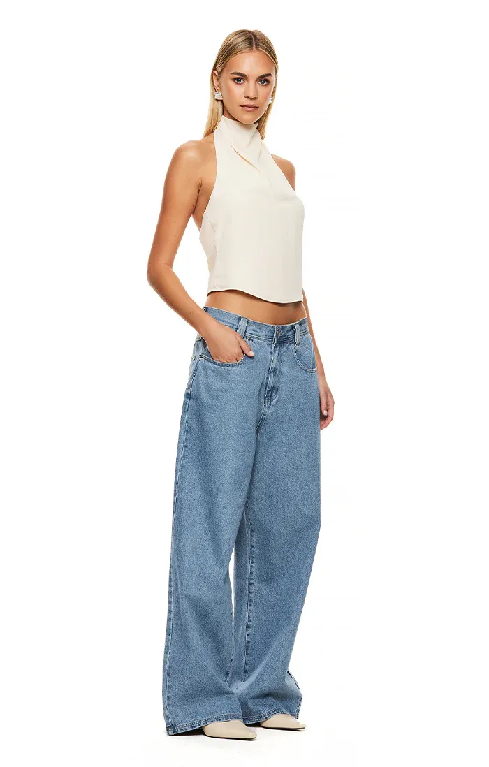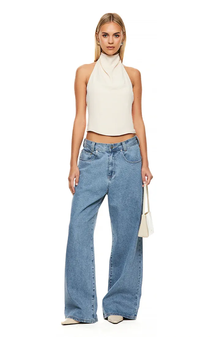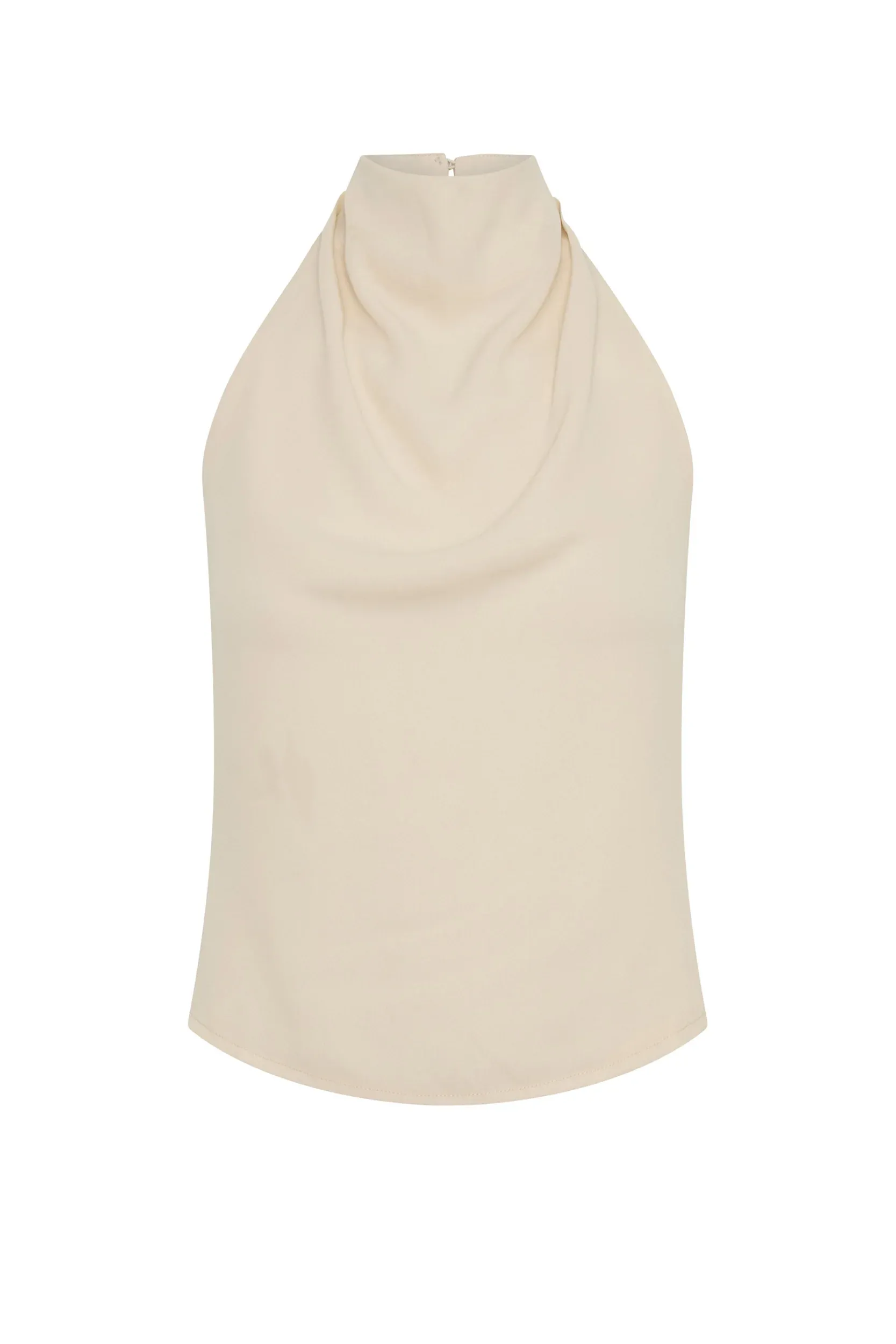 The Mya Bone Top by Nakedvice is a low back, halter top. Featuring a cowl neck and tie up back detail. To complete your look, pair with the Maxwell Jeans.